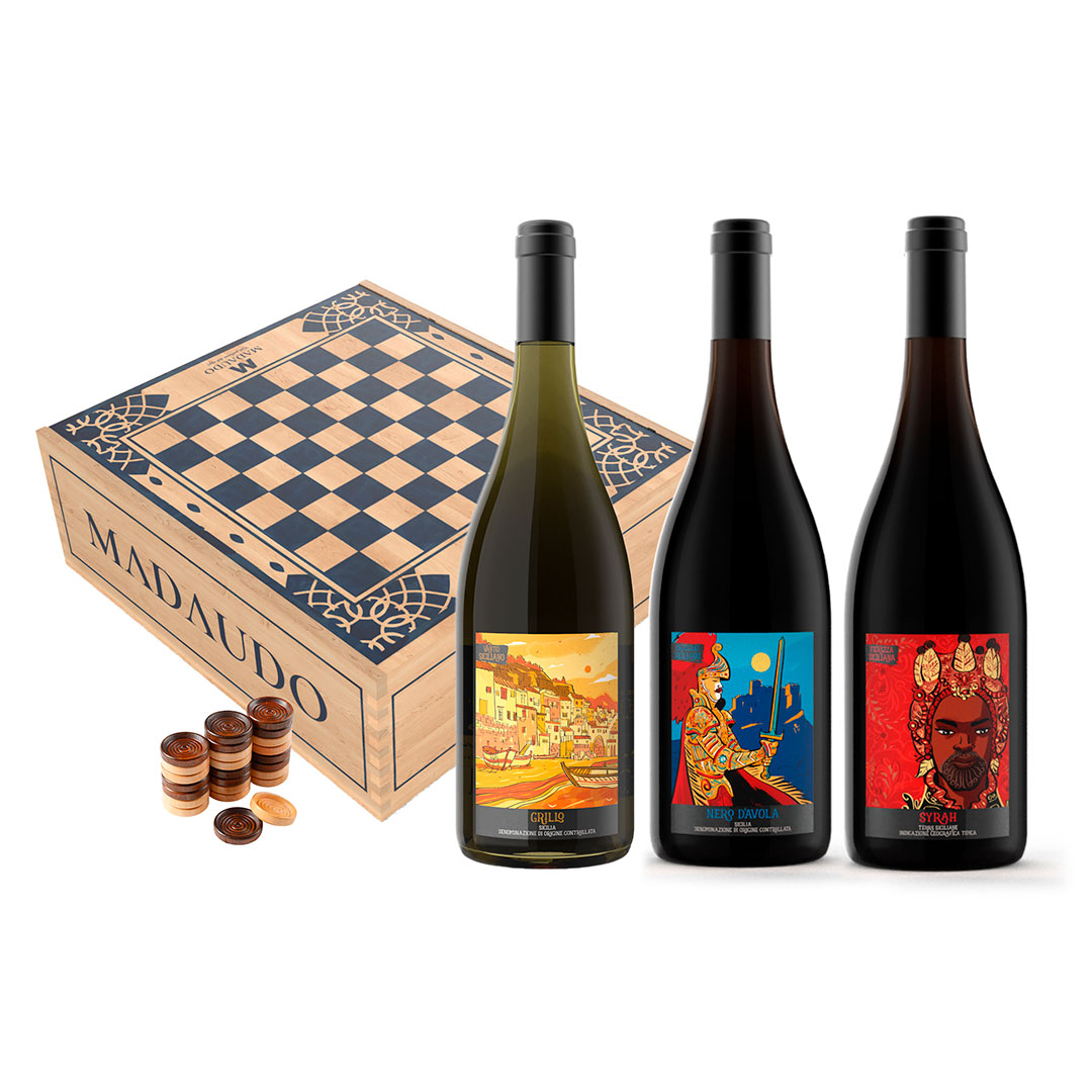 Cassetta in Legno “Gioco Dama” – 3 Bottiglie: Grillo DOC Sicilia – Nero d’Avola DOC Sicilia – Syrah IGT Terre Siciliane